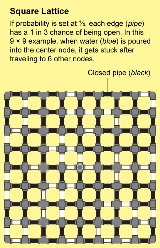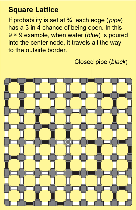 The networks in fractured rock or linked polymers are extremely intricate. It would be nearly impossible to describe their structure precisely, but Broadbent and Hammersley showed that they can be approximated by repeating patterns that are amenable to analysis. The simplest example is a square lattice, which looks like an endless sheet of graph paper: the nodes are arranged in a grid and are connected by four edges to their neighbors.