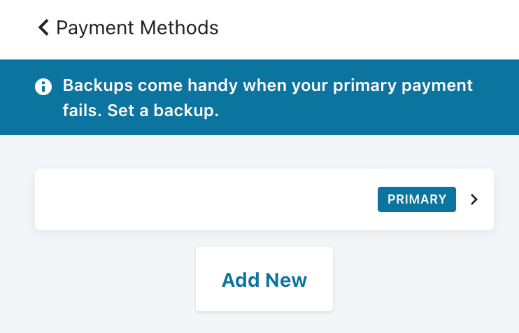 To add a new payment method, click the Add New button. To remove or update an existing payment method, select said payment method.